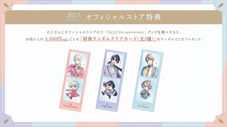にじさんじオフィシャルストアにて「VΔLZ 5th Anniversary」グッズを購入すると、お買い上げ3,000円(税込)ごとに 「特典ランダムクリアカード(全3種)」を1枚プレゼント